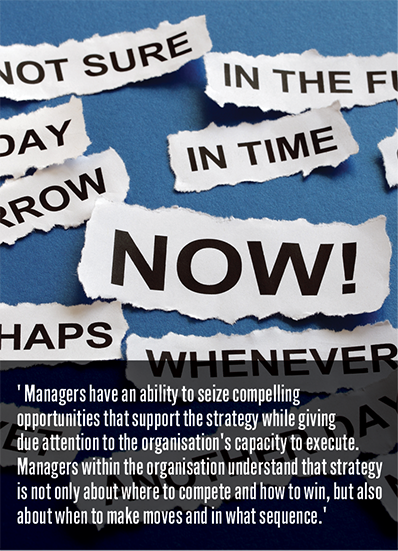 Managers have an ability to seize compelling opportunities that support the strategy while giving due attention to the organisation’s capacity to execute. Managers within the organisation understand that strategy is not only about where to compete and how to win, but also about when to make moves and in what sequence.