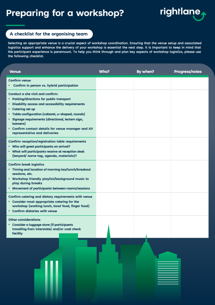 Selecting an appropriate venue is a crucial aspect of workshop coordination. Ensuring that the venue setup and associated logistics support and enhance the delivery of your workshop is the essential next step. It is important to keep in mind that the participant experience is paramount. To help you think through and plan key aspects of workshop logistics, please use the following checklist.
