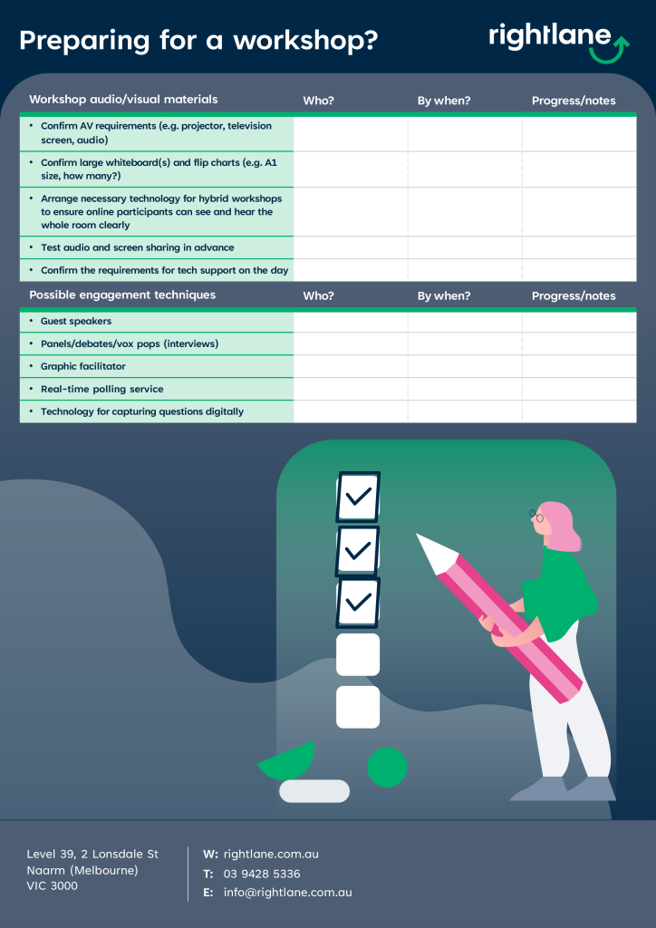 Selecting an appropriate venue is a crucial aspect of workshop coordination. Ensuring that the venue setup and associated logistics support and enhance the delivery of your workshop is the essential next step. It is important to keep in mind that the participant experience is paramount. To help you think through and plan key aspects of workshop logistics, please use the following checklist.